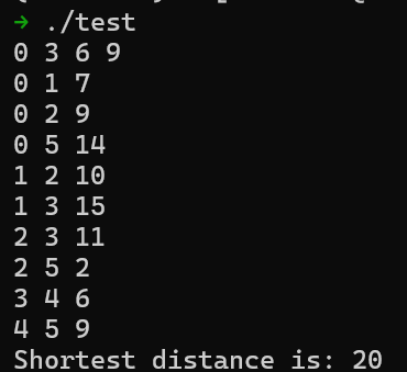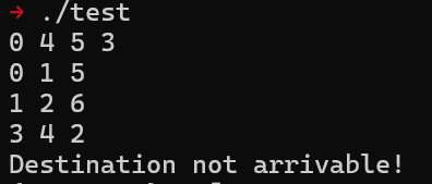 1 2 3 4 5 6 7 8 9 10 11 12 13 14 15 16 17 18 19 20 21 22 23 24 25 26 27 28 29 30 31 32 33 34 35 36 37 38 39 40 41 42 43 44 45 46 47 48 49 50 51 52 53 54 55 56 57 58 59 60 61 62 63 64 65 66 67 68 69 70 71 72 73 74 75 76 #include <iostream> #include <utility> #include <vector> #include <climits> #include <queue> typedef std::pair<int , int > EdgeOut;typedef std::vector<std::vector<EdgeOut>> Graph;int dijkstra (const Graph& graph, int node_nr, int start, int end) { std::vector<int > dist (node_nr, INT_MAX) ; std::vector<bool > visited (node_nr, false ) ; dist[start] = 0 ; for (int i = 0 ; i < node_nr; i++) { int n, min_dist = INT_MAX; bool found = false ; for (int j = 0 ; j < node_nr; j++) { if ((!visited[j]) && (dist[j] < min_dist)) { n = j; min_dist = dist[j]; found = true ; } } if (!found) { break ; } visited[n] = true ; for (int j = 0 ; j < graph[n].size (); j++) { int m = graph[n][j].first; int w = graph[n][j].second; if ((!visited[m]) && (dist[m] > (dist[n] + w))) { dist[m] = dist[n] + w; } } } return dist[end]; }int main (int argc, char **argv, char **envp) { int edge_nr, node_nr; int start, end, shortest; std::cin >> start >> end >> node_nr >> edge_nr; Graph graph (node_nr) ; for (int i = 0 ; i < edge_nr; i++) { int u, v, w; std::cin >> u >> v >> w; graph[u].push_back ({v, w}); } shortest = dijkstra (graph, node_nr, start, end); if (shortest != INT_MAX) { std::cout << "Shortest distance is: " << shortest << std::endl; } else { std::cout << "Destination not arrivable!" << std::endl; } return 0 ; }