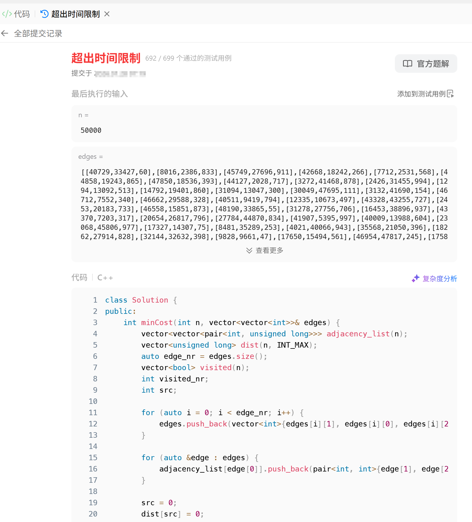 以 Leetcode 的 3650. 边反转的最小路径总成本 为例,这是一道非常朴素的 Dijkstra 无向图的题目,但是给的部分测试点的结构非常大,会导致朴素 Dijkstra 算法 TLE