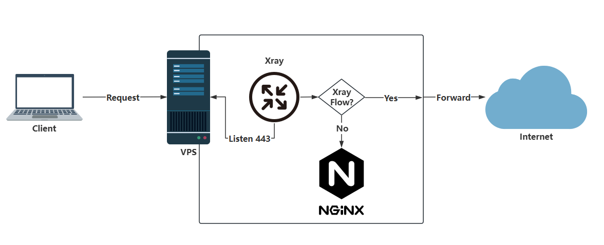 目前有两种主流方案:Xray 前置与 NGINX 前置,前置意味着该节点负责接收所有流量,并分流到相应的服务上,Xray 前置则意味着由 Xray 检测协议,并将非 VLESS/Trojan/... 协议“回落”到 NGINX,NGINX 前置则反过来