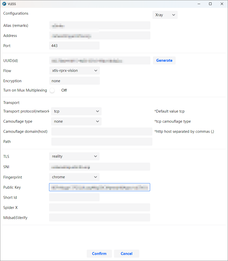 使用 v2rayN 按照和 Android 上的 V2rayNG 基本一样的方式配置就行,图上空的就是直接留空: