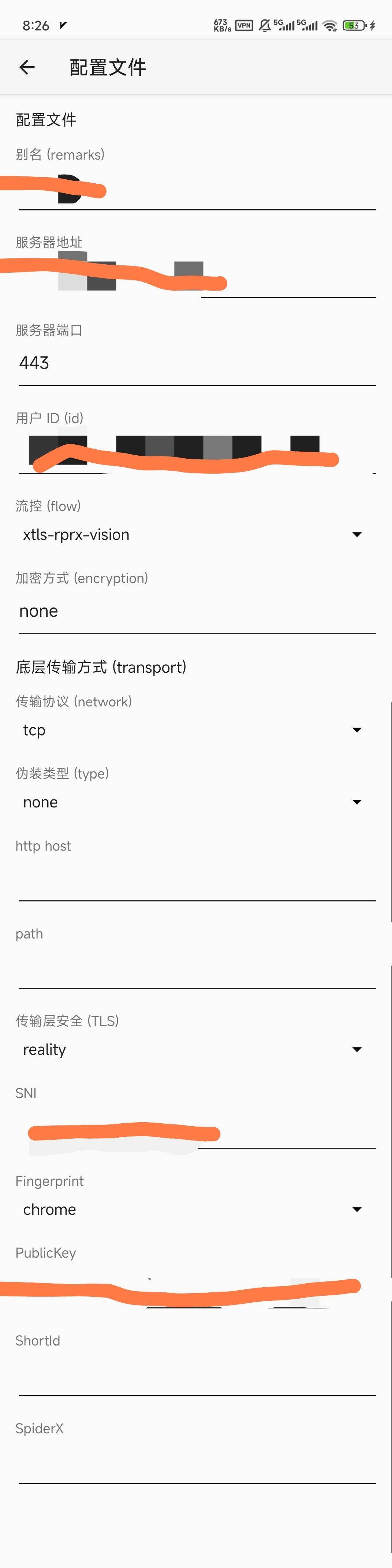对于 Android 系统,可以在 Google Play 商店下载 v2rayNG,参照前面 Linux 客户端的 config.json 手动输入 vless 相关配置即可,图上没画线也没字的就是留空的意思: